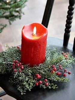 シダーと赤いベリーを組み合わせた小さめのリース。ミックスグリーンのやわらかな枝や実は霜がついたようなキラキラ仕上げです。ピラーキャンドルと合わせても素敵です。1点ずつ多少仕上げやサイズが異なります。写真のピラーキャンドルは別売りです。
