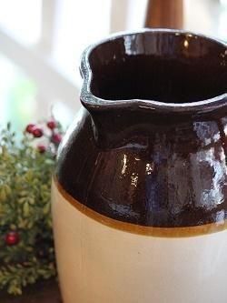 オハイオ州にあった陶器メーカーのRRP社のポタリー。ダークブラウンとライトベージュの2色使いで、アーリーアメリカンな雰囲気の大きなピッチャーです。古いものですが、できるだけきれいな状態のものを選んでいます。底に刻印入り。写真のブッシュは別売りです。