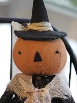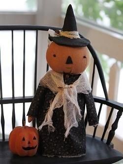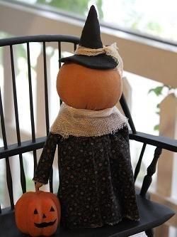 アメリカの作家さんが手作りした魔女のパンプキンドール。黒の小模様のドレスにコーヒー染めのチーズクロスのストールがプリミティブな作品です。ハンドメイドのため、1点ずつ仕上げが多少異なります。帽子は固定で、写真のパンプキンなどは別売りです。