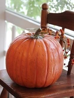 アメリカのメーカーがデザインした大きくてリアルなパンプキン。渋めのオレンジに文字が彫られたデザインで、ブリキの葉がついたプリミティブなレジン製です。廃番デザインのため、再入荷は未定です。写真のリースは別売りです。
