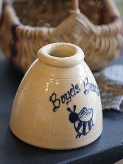 アメリカのBoyds Bears社が限定発売したミニポタリー。アメリカのポタリーメーカーが1点ずつ手作りした、ハートやロゴの絵付けが素敵なポタリーです。写真のバスケットはディスプレイ。廃番アイテムのため、入荷ごとに状態や価格は異なります。ハンドメイドのため、多少のキズや色むらはご了承ください。