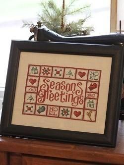アメリカで手作りされたアンティークの刺繍フレーム。オフホワイトの布に渋めのレッドとグリーンの配色でクリスマスのモチーフが細かく刺繍された作品で、マットな黒の木製フレームに入っています。アクリルガラス入りで、壁掛け用の金具付き。