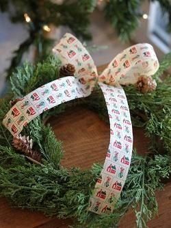 アメリカで作られたヴィンテージのリボン。張りのあるコットン地でカントリーなクリスマス柄です。1m単位で、写真のリボンが作れます。リースなどはディスプレイ。廃番デザインのため、在庫かぎりです。