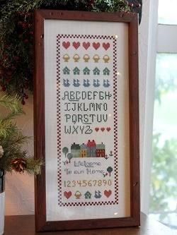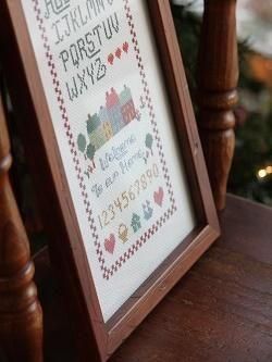 アメリカで手作りされたアンティークの刺繍フレーム。オフホワイトの布にカントリーモチーフとアルファベットが刺繍されたかわいい作品です。渋めのブラウンの木製フレームにガラス入り。フレームはわざとキズをつけたアンティーク仕上げで、全体にとてもきれいな状態です。壁掛け用のワイヤー付き。