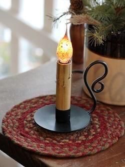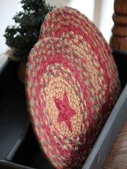 アメリカのメーカーがデザインしたブレイデッドラグのマット。クランベリーレッド、モスグリーン、ベージュの渋めの配色に赤の星をステンシルしたデザインで、小さめの丸型です。写真のランプなど別売りです。裏表飾れます。ジュート素材入りで水洗いはできません。手編みのため、1枚ずつ多少サイズや形が異なります。