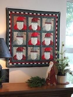 アメリカで手作りされたアンティークの壁掛けキルト。渋めのグリーンとレッドの色合わせで、Debbie Mummさんの図案のパッチワークにハンドキルティングで仕上げた作品です。壁に飾りやすいサイズで、キルトバー通しもついています。古いものですが、新品のようなきれいな状態です。