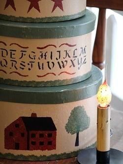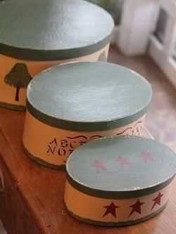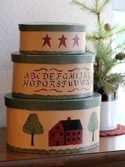 アメリカで手作りされた大きめのボックスセット。渋めのベージュとグリーンの色使いにハウスなどのステンシルのオーバルボックス3個セットです。アンティーク仕上げの古いもので、全体にきれいな状態です。