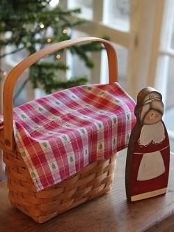 ツリー柄がかわいいクリスマスのミニクロス。クランベリーレッドにツリーが織り込まれたヴィンテージの布で仕上げました。廃番デザインの布のため、在庫かぎりです。写真のバスケットなどは別売りです。