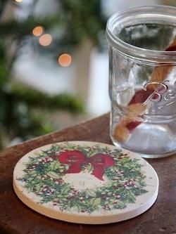 アメリカのメーカーで作られたストーンコースター。絵柄のある表側が水滴を吸い取る素材でできていて、裏はコルク仕上げです。廃番デザインのため、在庫かぎりです。写真のグラスなどは別売りです。