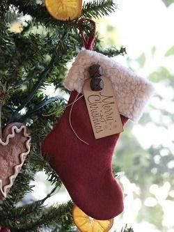 アメリカの作家さんが手作りしたストッキング。バーガンディ色のフェルトで作ったストッキングに渋めのタグやベルなどをアレンジしたオーナメントで、どちらの向きにも飾れます。ハンドメイドで、1点ずつタグのデザインは異なります。