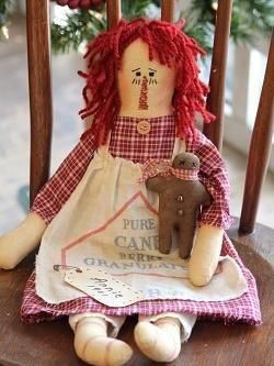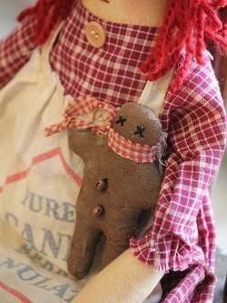 アメリカの作家さんが手作りしたアニードール。バーガンディのチェックのエプロンドレスで、ジンジャーマンのミニドールを持ったプリミティブな雰囲気の大きめのドールです。手書きのタグ付き。ジンジャーマンは外して別々にも飾れます。